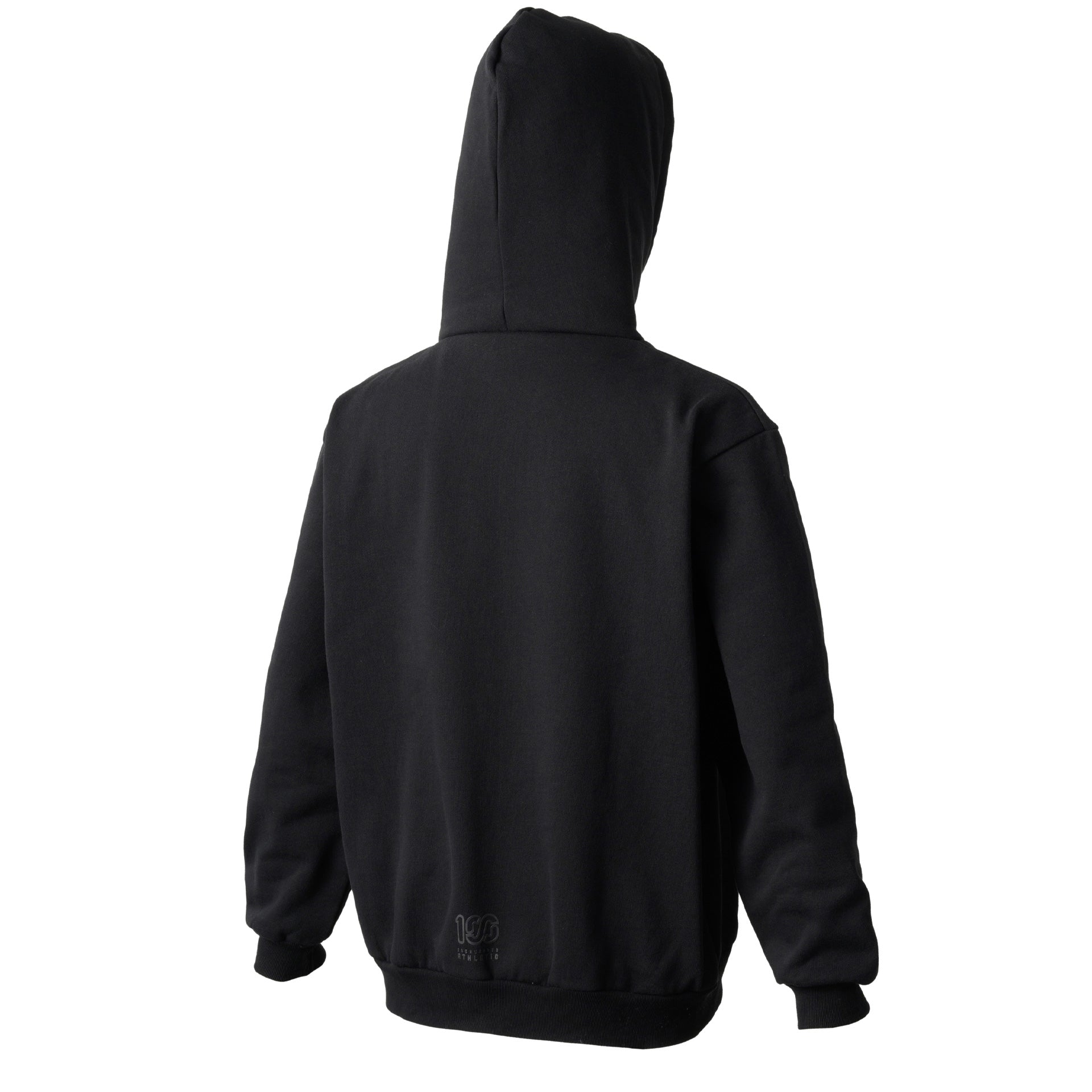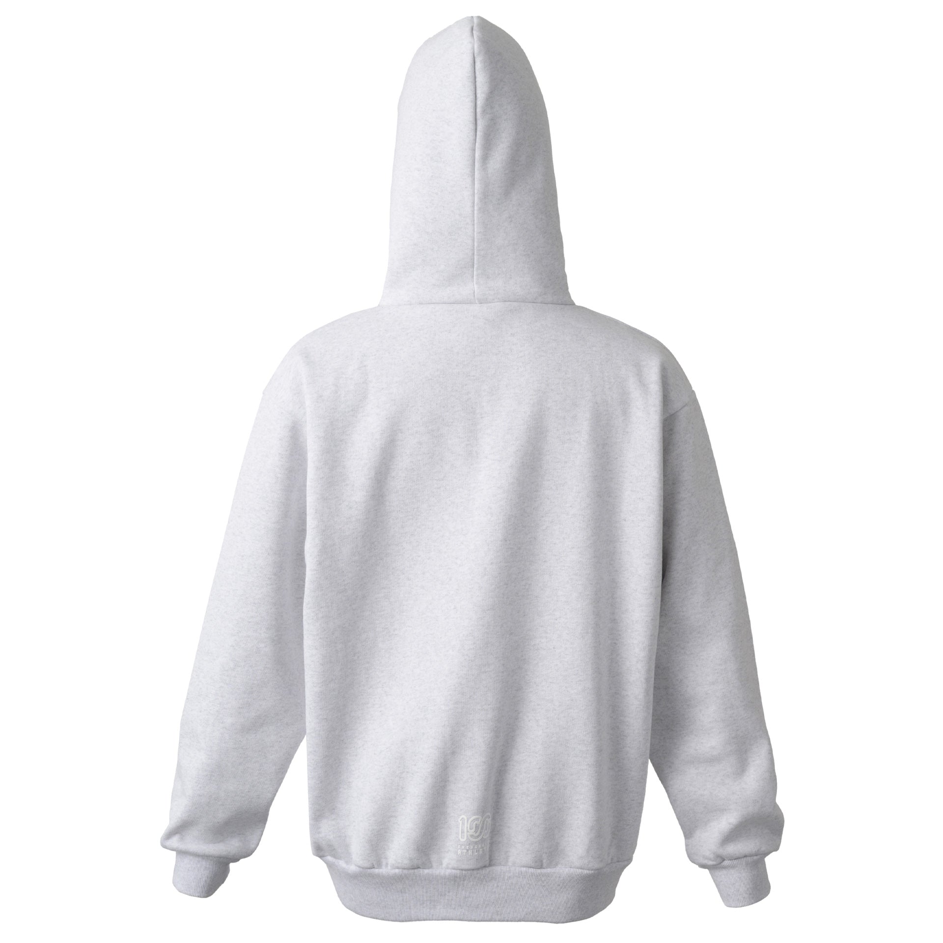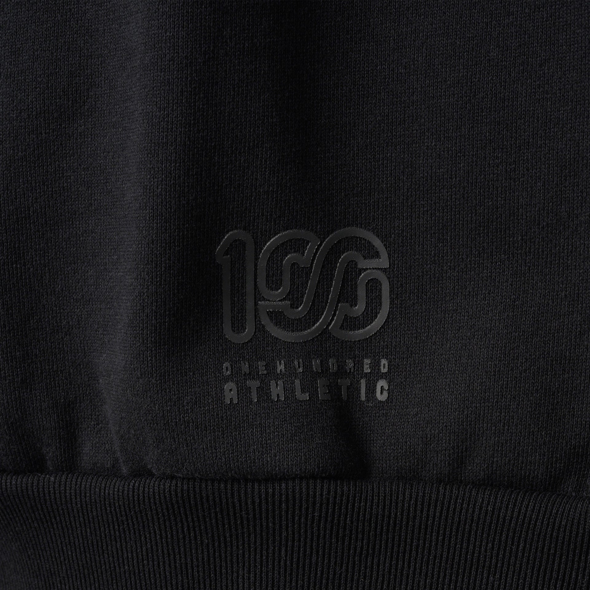 頑丈な編み立てに裏起毛を施した、15ozというボリュームの極厚生地を採用しました。オープンエンド糸を使用しているのでザラッとしたシャリ感とともに適度な保温性と吸湿性も有します。フロントとバックにそれぞれ100Aロゴを厚くプリントし、左袖口に100ロゴを刺繍。