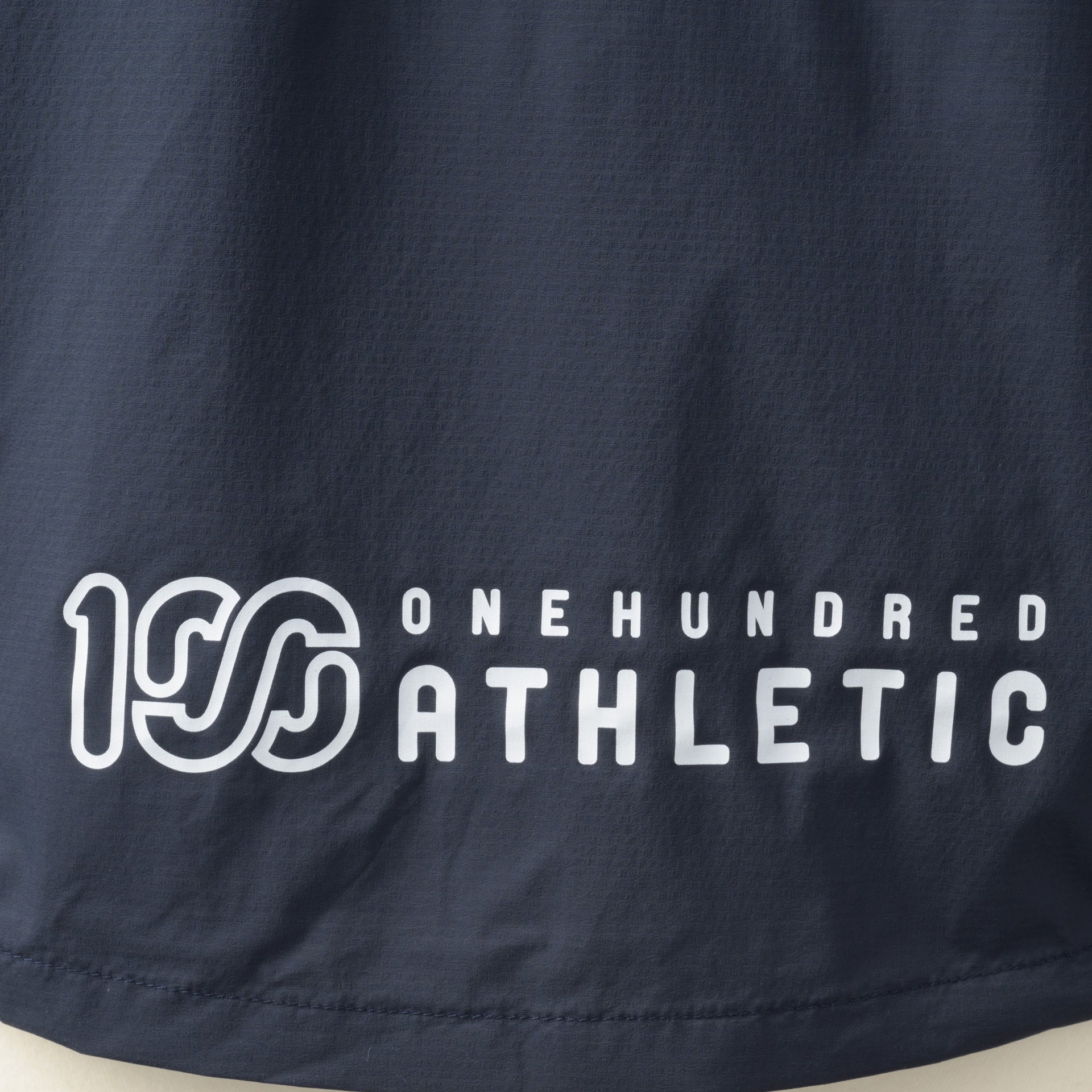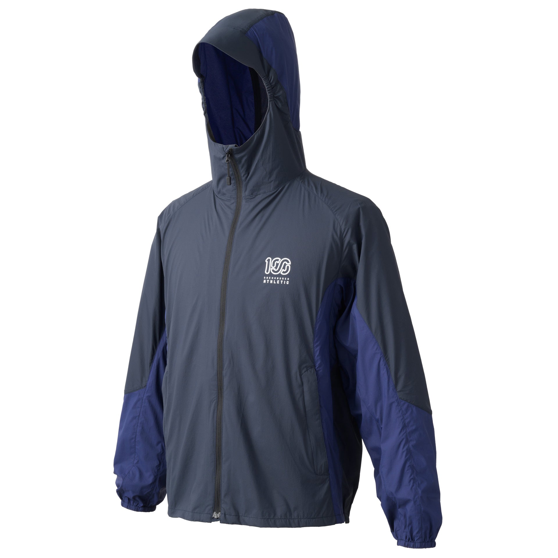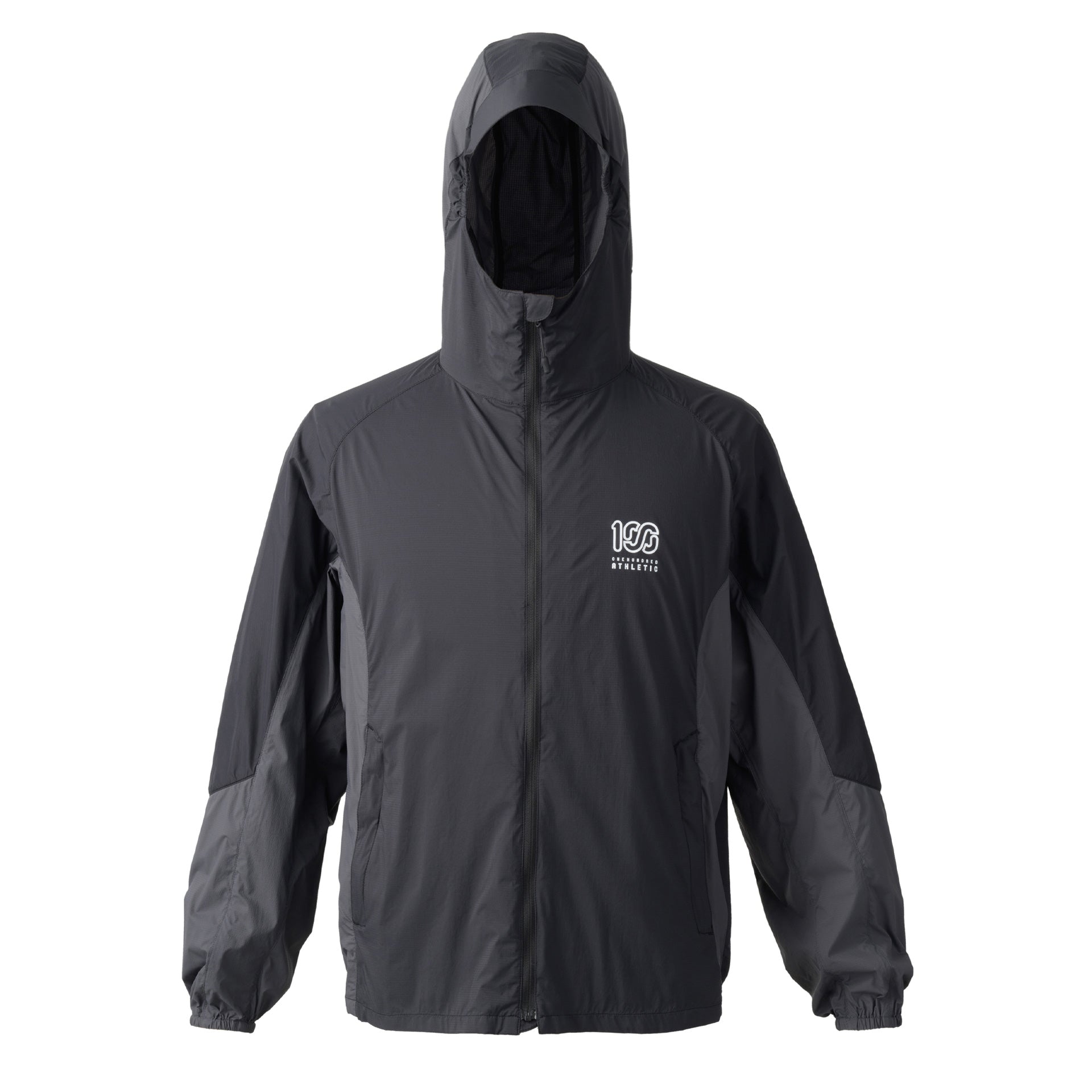 軽量で柔らかく適度な耐水性と透湿性のあるLEOFEEL®/レオフィールという素材を採用し、機能性としなやかな着心地を備えたジャケットに仕立て上げました。ウォーミングアップなどの軽い運動時や、外気に対して体温調整をするときに軽く羽織ったりと、幅広いシーンで活躍します。左胸には100Aスクエアロゴを、後ろ裾には100Aレクタングルロゴをプリント、両サイドにファスナー付きポケットを装備。