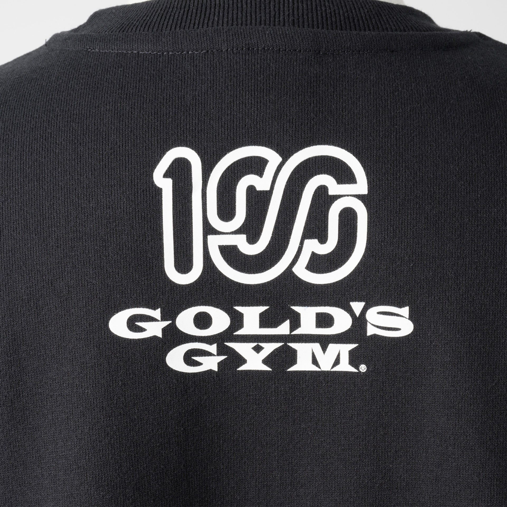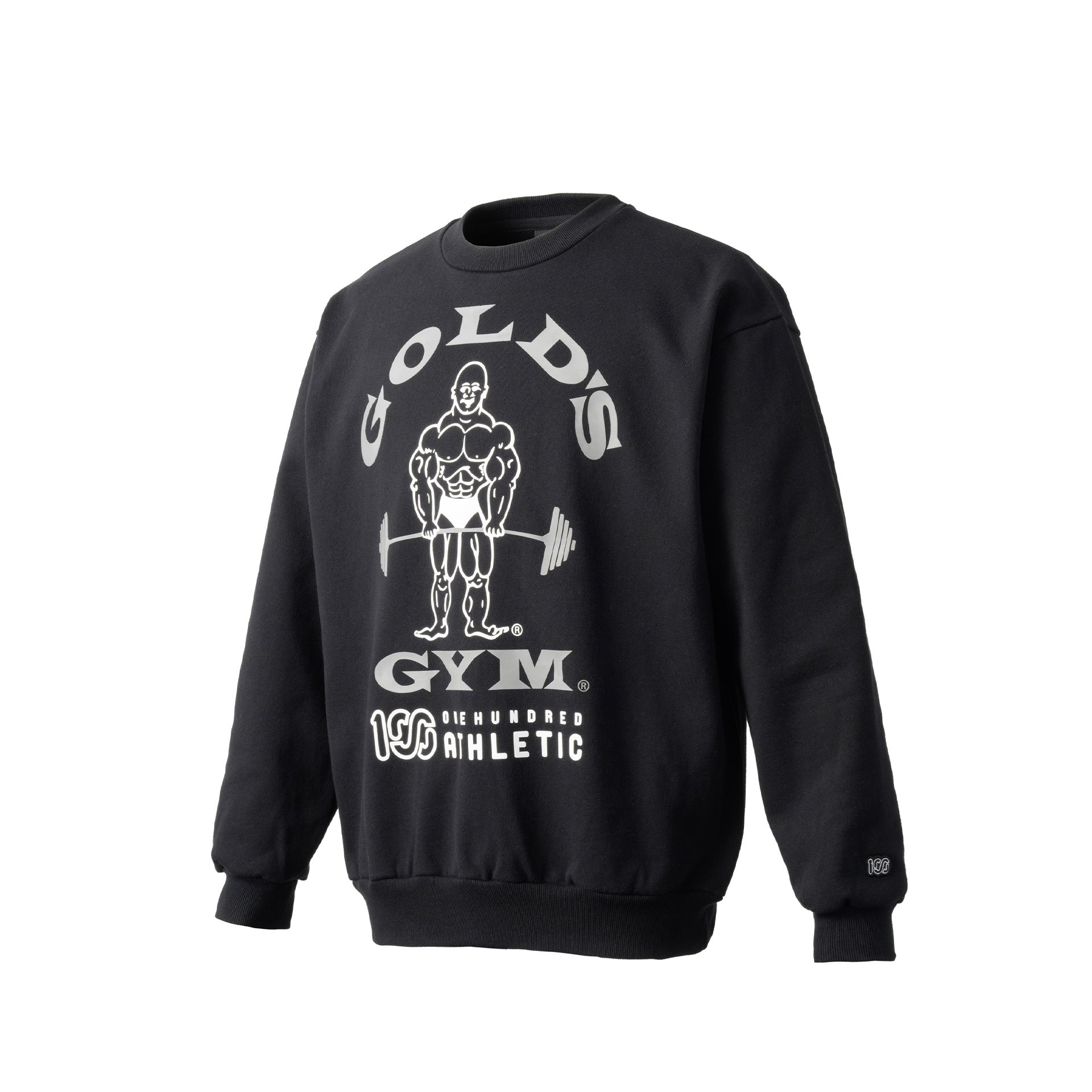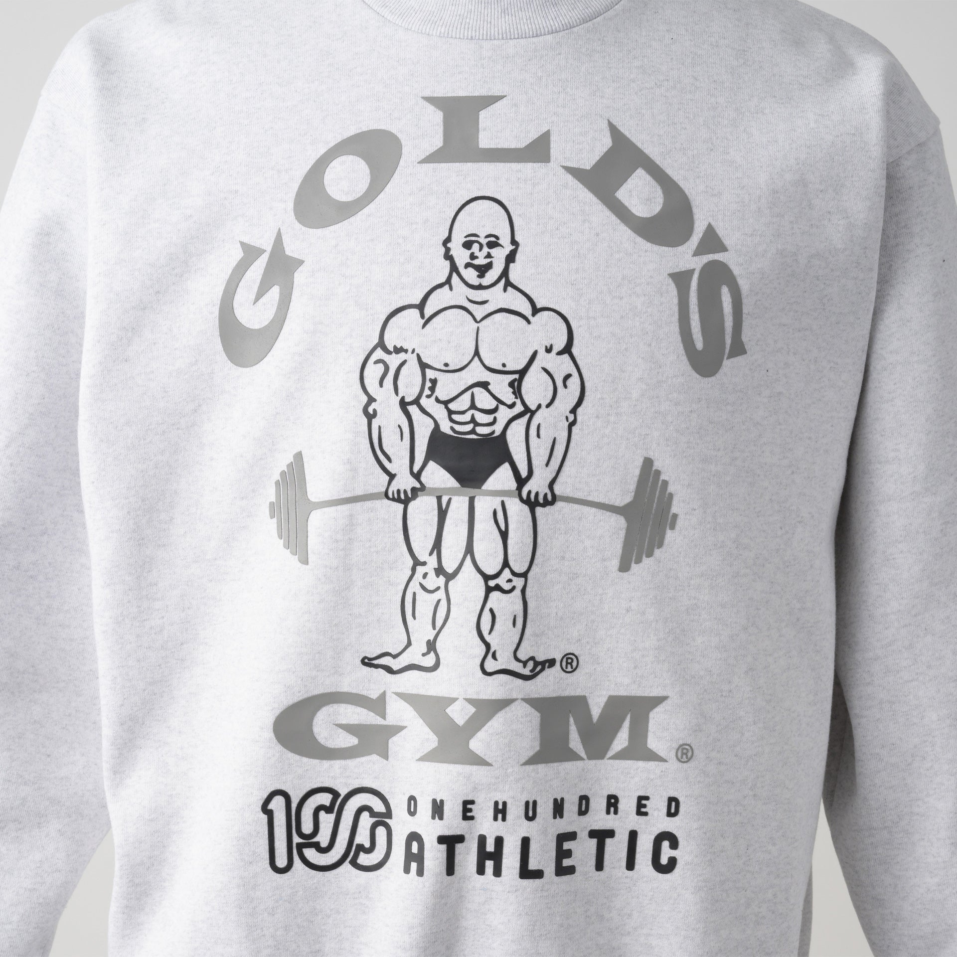 頑丈な編み立てに裏起毛を施した、15oz というボリュームの極厚生地を採用しました。オープンエンド糸を使用しているのでザラッとしたシャリ感とともに適度な保温性と吸湿性も有します。フロントにはGOLD'S GYM のオールドマンと100A のレクタングルロゴを組み合わせたネームドロップのデザインをプリントし、バックにはGOLD'S GYM と100A のロゴを組み合わせたコラボレーションロゴをプリント。
